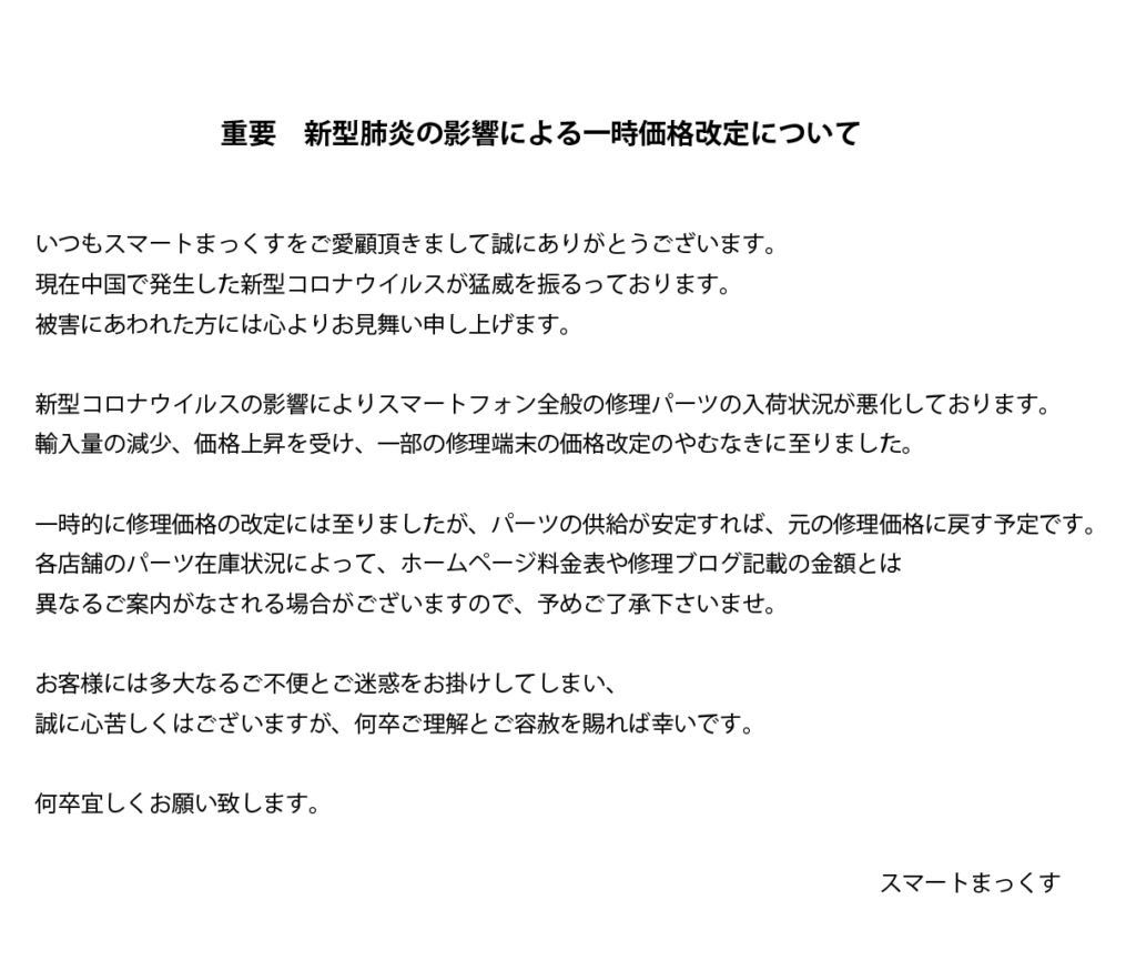 重要 新型肺炎の影響による一時価格改定について
