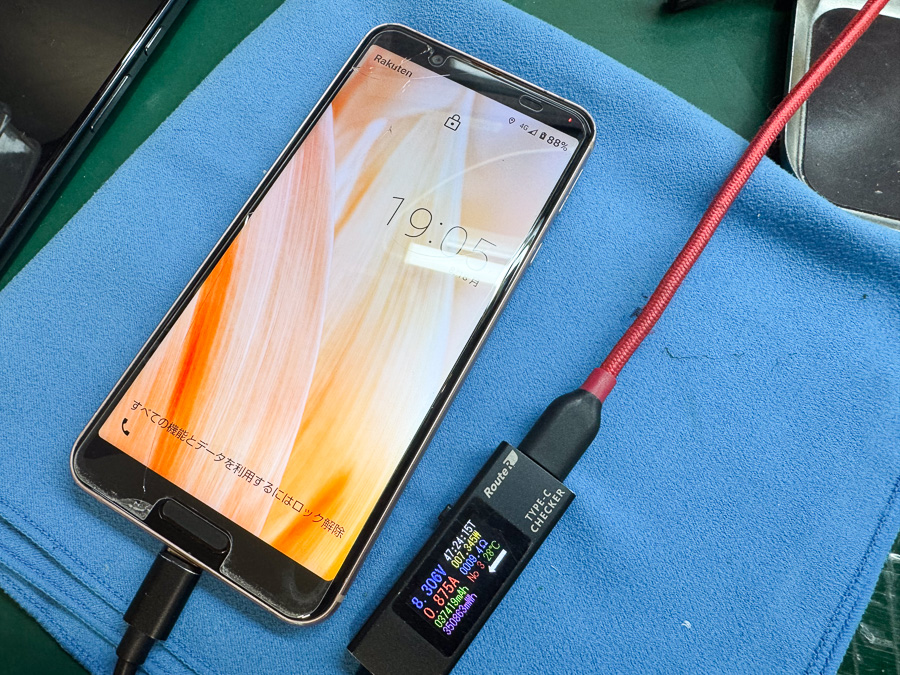 また、充電器をつなぐと0.8A程と正常に見える電流が流れていますが、本体が異常発熱をしてしまっています。