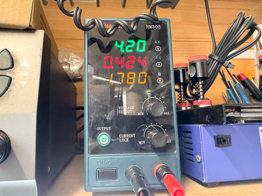 まずは本体からメイン基板を取り出して、故障の考えられる箇所に安定化電源を接続し電圧を印加してみます….