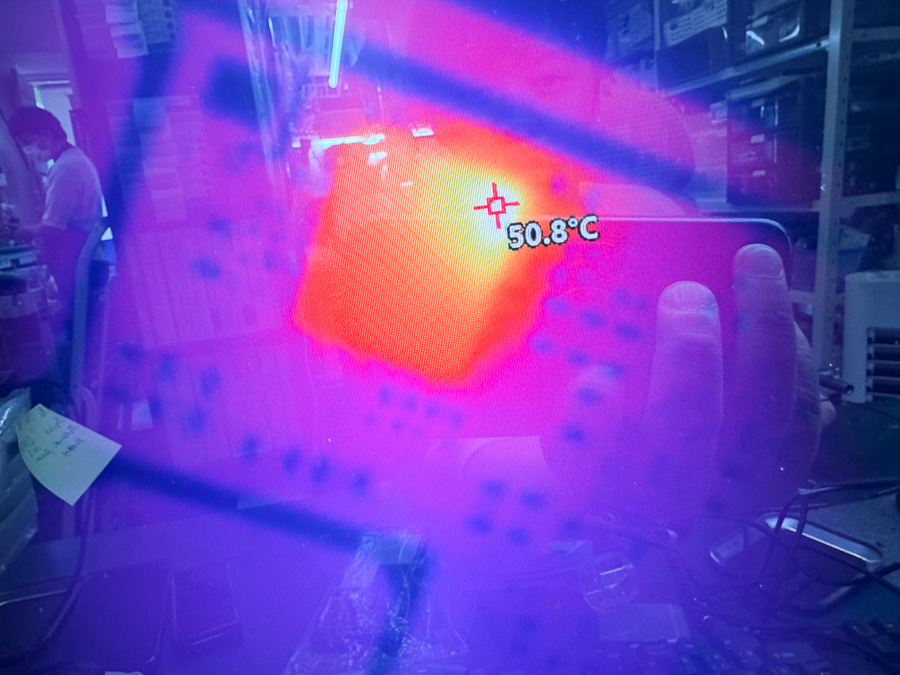 サーモグラフィーカメラで観察したところ、電源ICに強い発熱が確認されました。