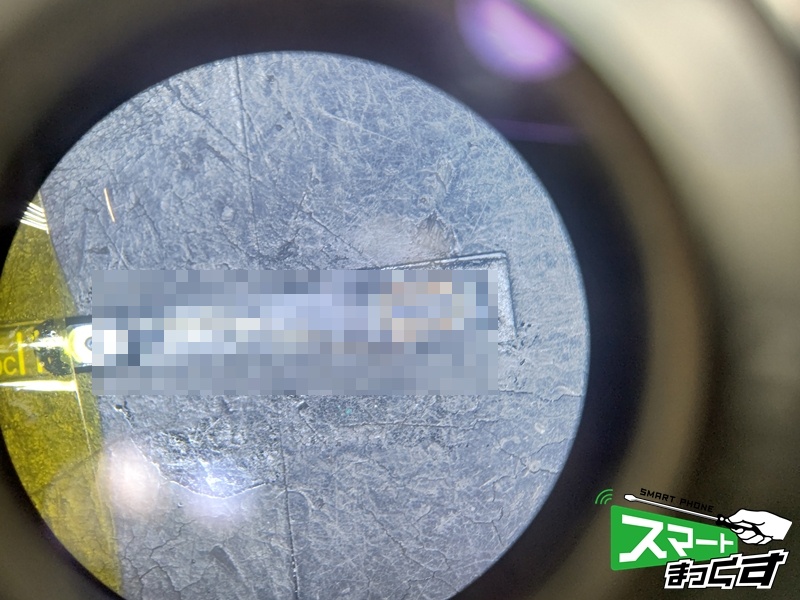 こちらは、顕微鏡を使い、電源ボタン周りの回路を拡大した写真です。やはり今回も内部の断線を確認しましたので、修復していきます。