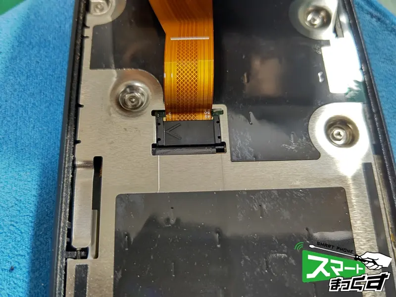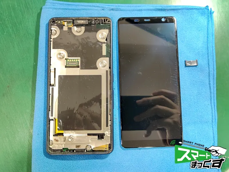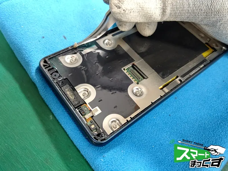 「落としてから画面が真っ暗になって映らなくなってしまった」とのお悩みでお持ち込みいただきました。arrows BZ01は高い耐衝撃性能を誇るビジネスモデルですが、強い衝撃が加わると内部の液晶パネルが破損し、表示不良を起こすことがあります。画面が見えない状態では仕事の連絡も取れず、データのバックアップも不可能です。 メーカー修理では初期化が基本となりますが、スマートまっくすでは故障した画面パーツのみを交換するため、大切なデータはそのままで即日修理が可能です。 それでは実際の修理工程をご紹介します。