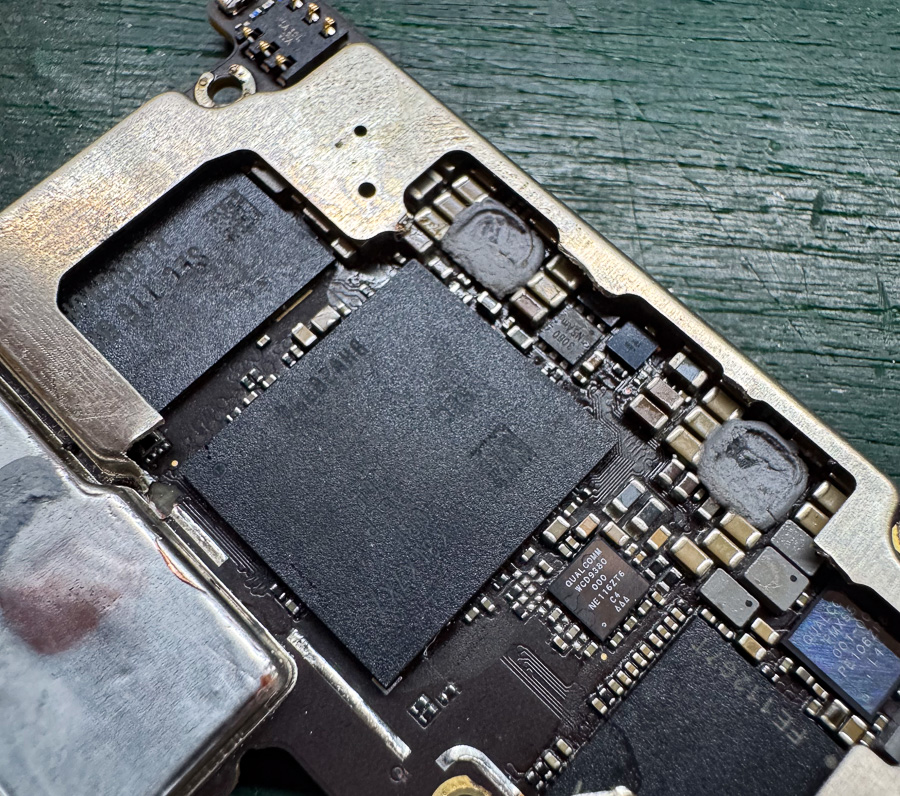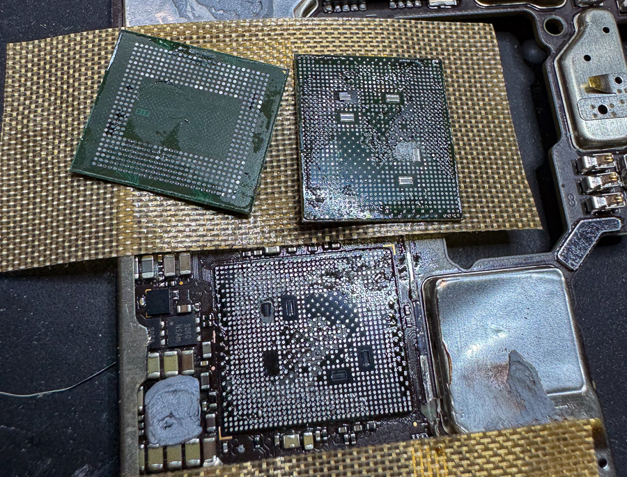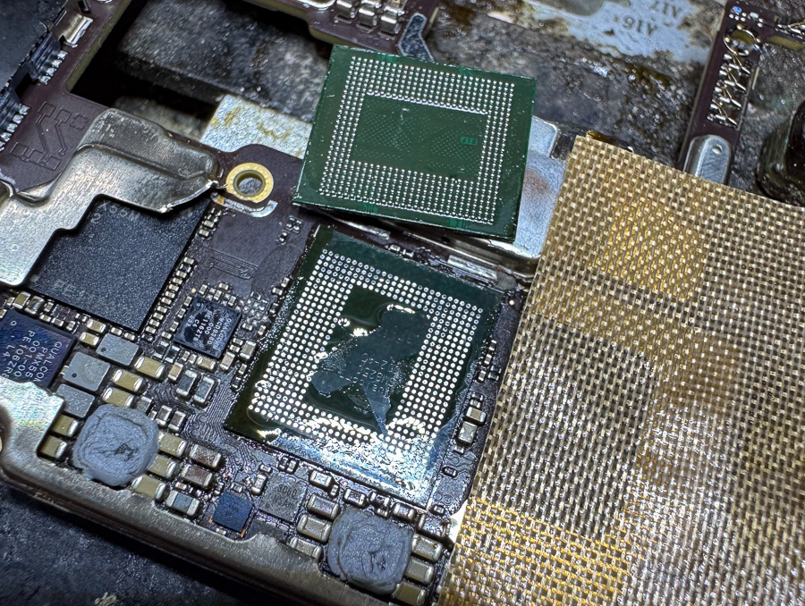 今回はCPUとRAMが重なって実装されている機種のため、熱を与えながらはんだを溶かして一枚ずつ丁寧に剥がしていきます。