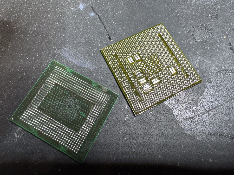 取り外したチップや基板の表面には、古いはんだやアンダーフィルの残りが付着しています。