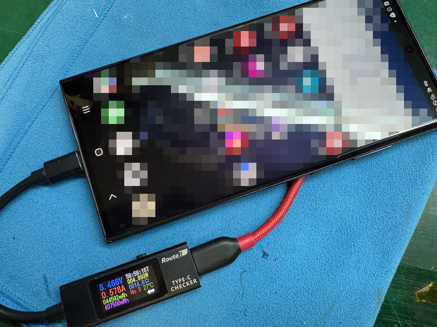 また、充電器を刺しても0.1Aほどと、ほとんど電流が流れず、特に表示もされない状態です。