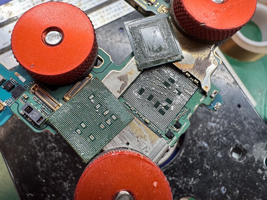 無事に取り外しが完了したら、基板とチップに残った「はんだ」や「アンダーフィル」に再度熱を与えて、丁寧に除去・清掃します。