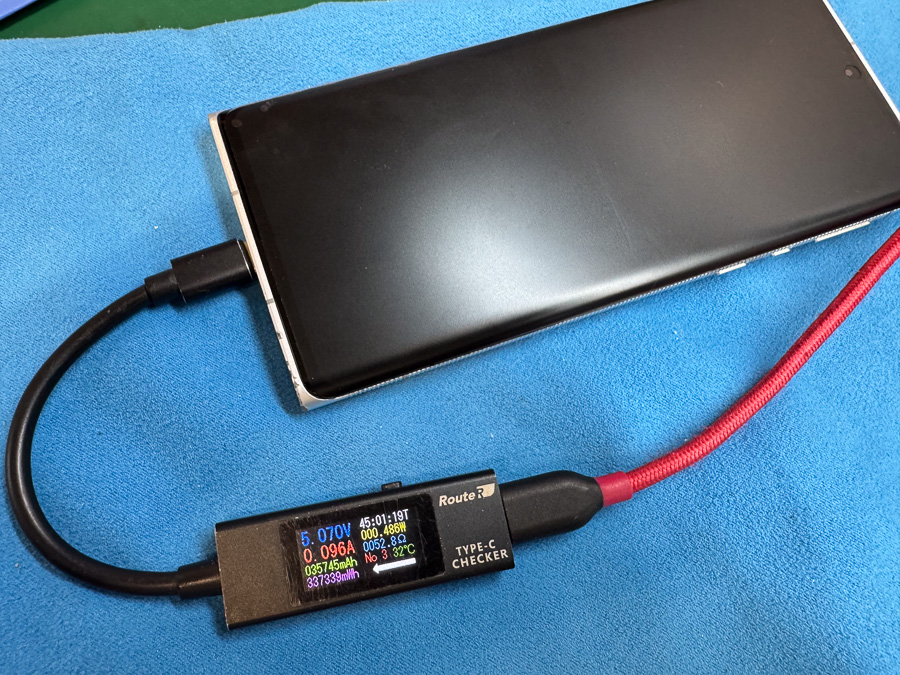 お客様のご申告の通りやはり電源は全く入りません。また、充電器を挿してみると0.096Aほどと、ほとんど電流が流れていない状態です。使用中に突然電源が落ちたという経緯も考えると基板自体の故障が疑われます。