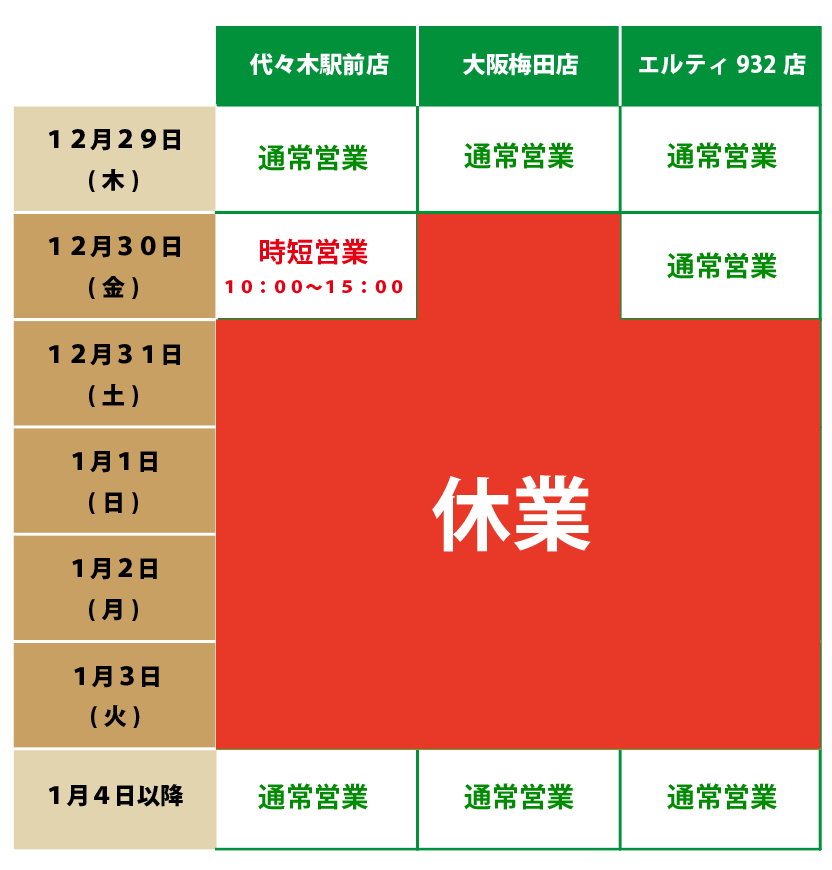 年末年始の営業時間について Posted on 2022年12月9日 by smartmaxwpadmin 年末年始の休業並びに時短営業のお知らせ 平素は格別のお引き立てをいただき、厚く御礼申し上げます。年末年始につきましては、まことに勝手ではございますが以下の通り休業させていただきます。ご迷惑をお掛けいたしますが、何卒ご理解賜りますようよろしくお願い申し上げます。