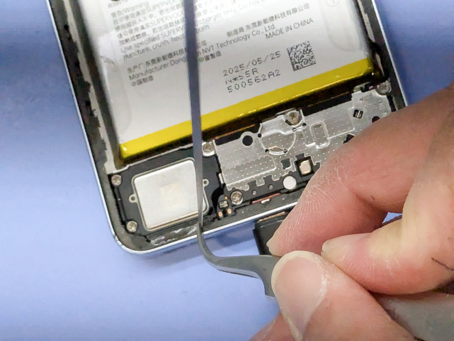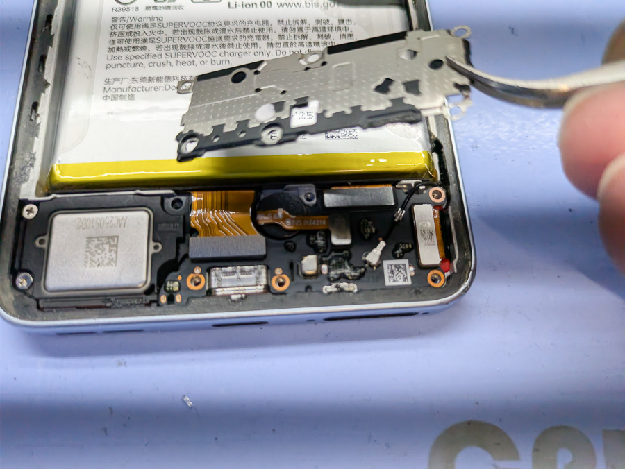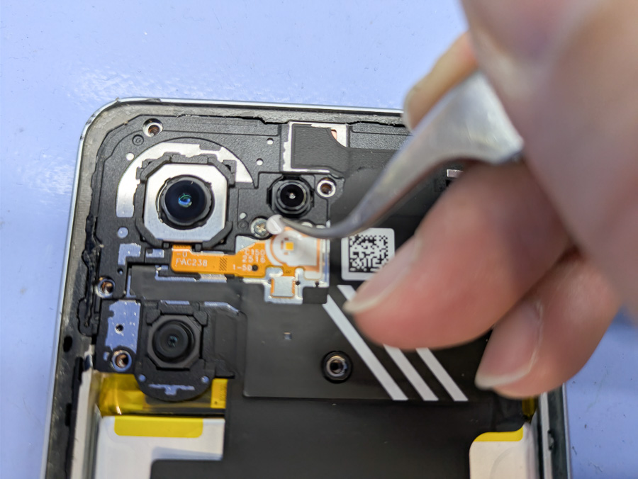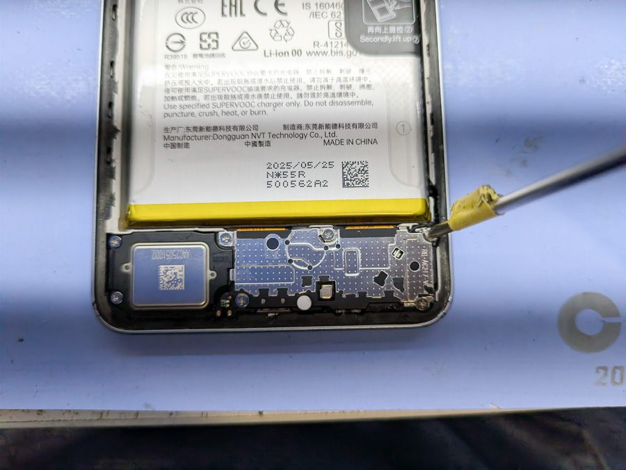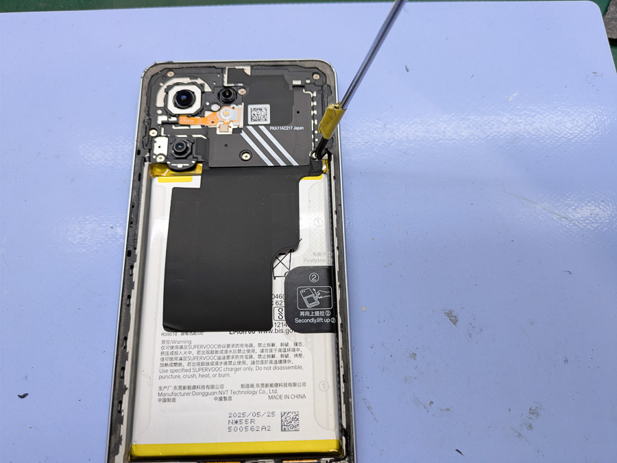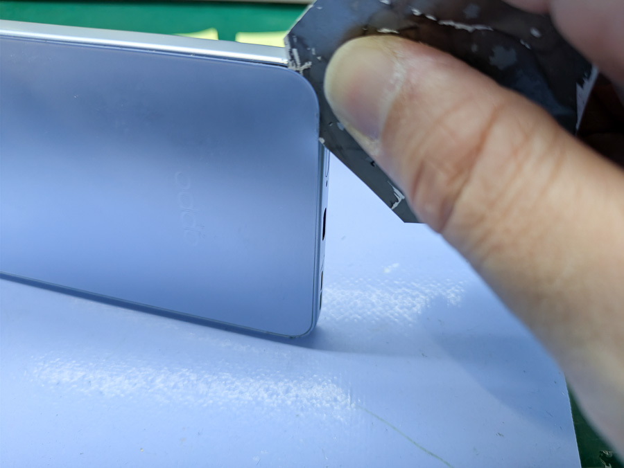 ヒートマットで本体を予熱して内部テープの貼り付きを弱めたら、背面パネルとフレームの隙間に柔らかいカードを差し込んで、本体を傷めないように剥がしていきます。