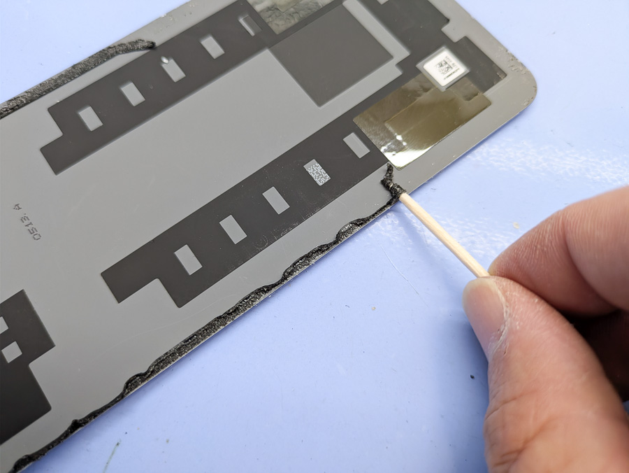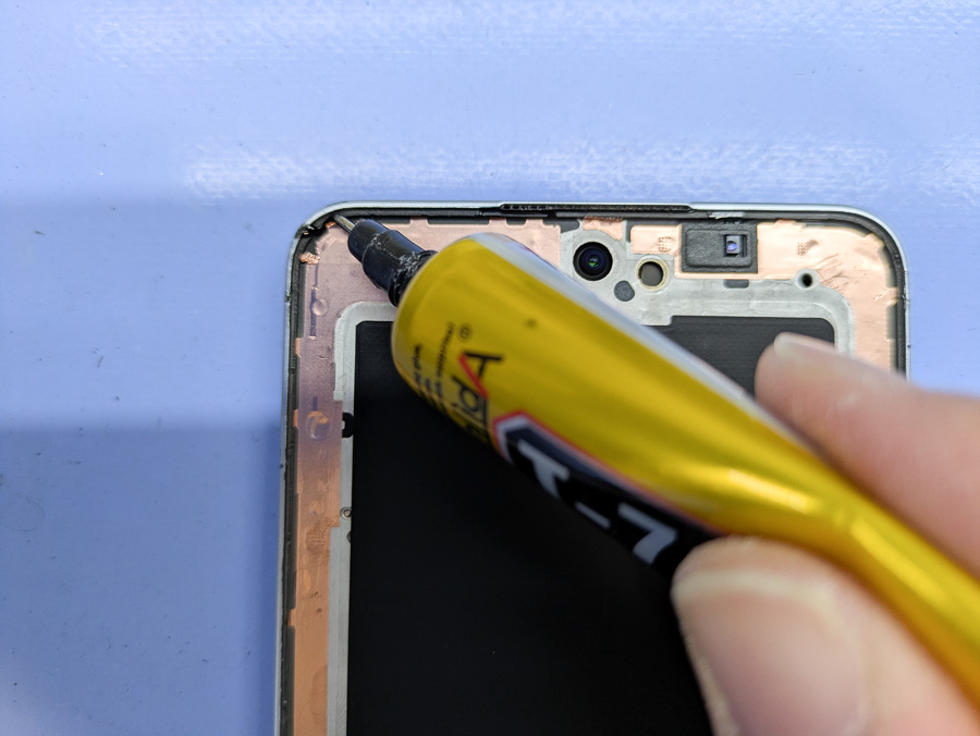 接着剤を剥がしたフレームを無水エタノールで清掃・脱脂して、新たに樹脂製の強力接着剤を塗布して、画面をしっかりと圧着します。