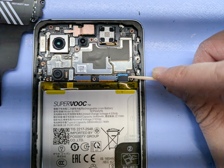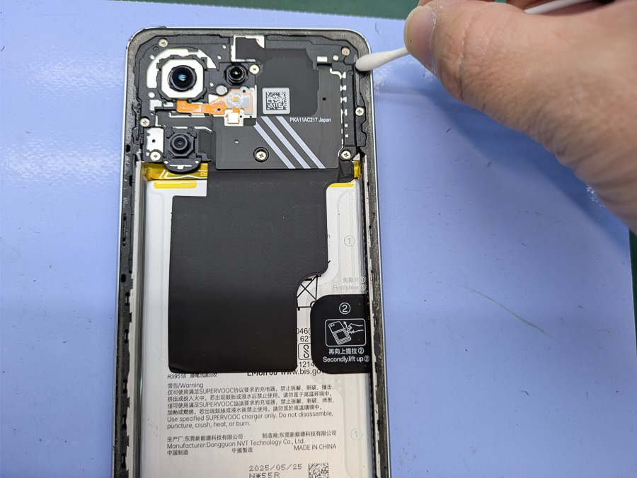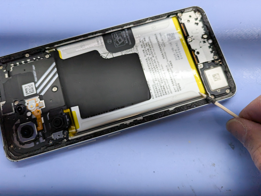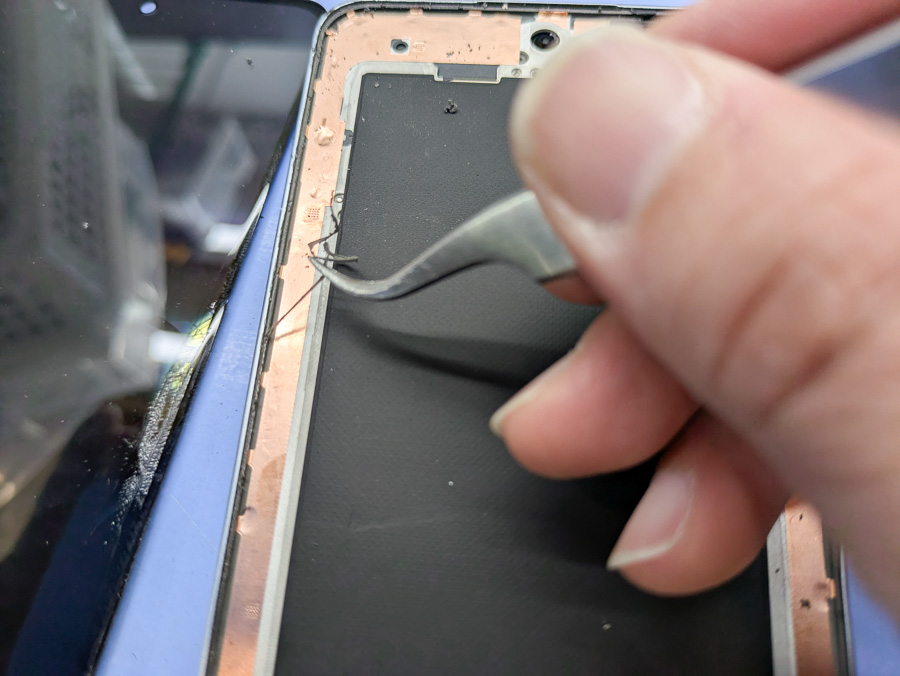 今回の機種は幅の狭いフレームだけで画面を固定する構造のため、修理後に画面が浮いてこないよう、念入りな清掃がとても重要になります。