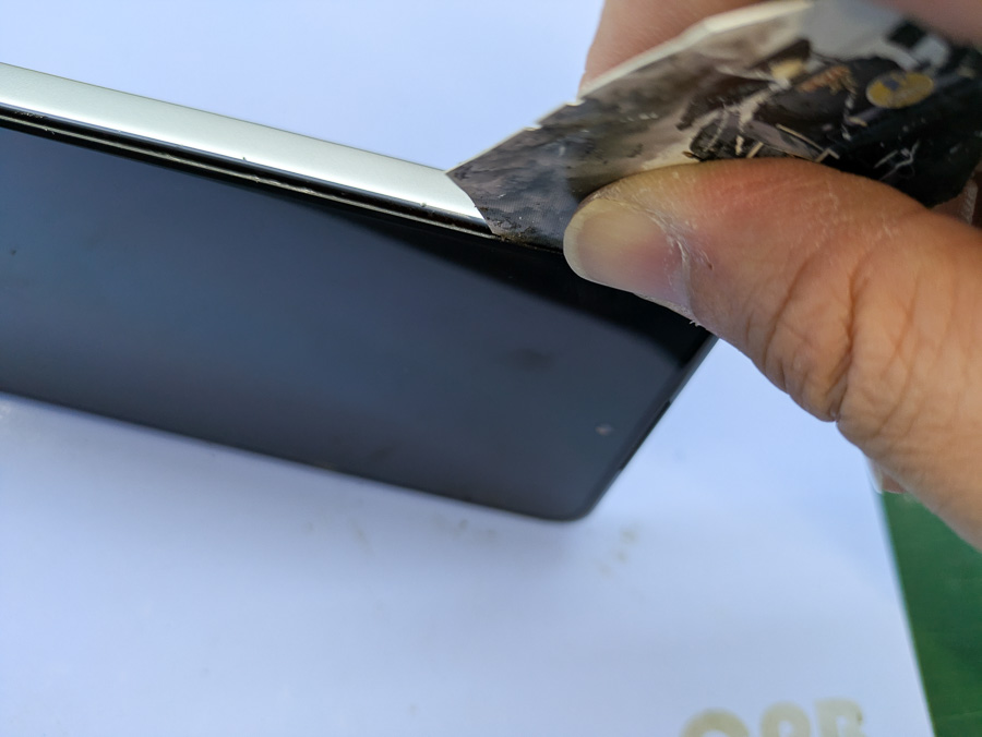 画面とフレームの隙間にカードを差し込んで、接着剤をカットするように剥がしていきます。