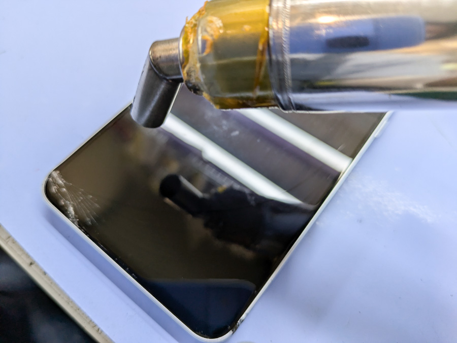 画面側をヒートガンで温めて、内部の接着剤を弱めます。