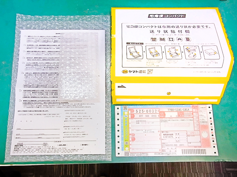 無料宅配キットをお申込みのお客様には上記のセットをお送りします。修理品の発送に必要な資材一式が全て揃っているので準備が簡単です!
