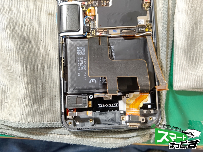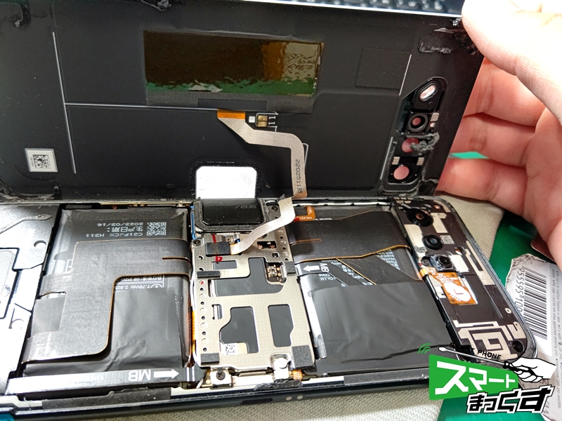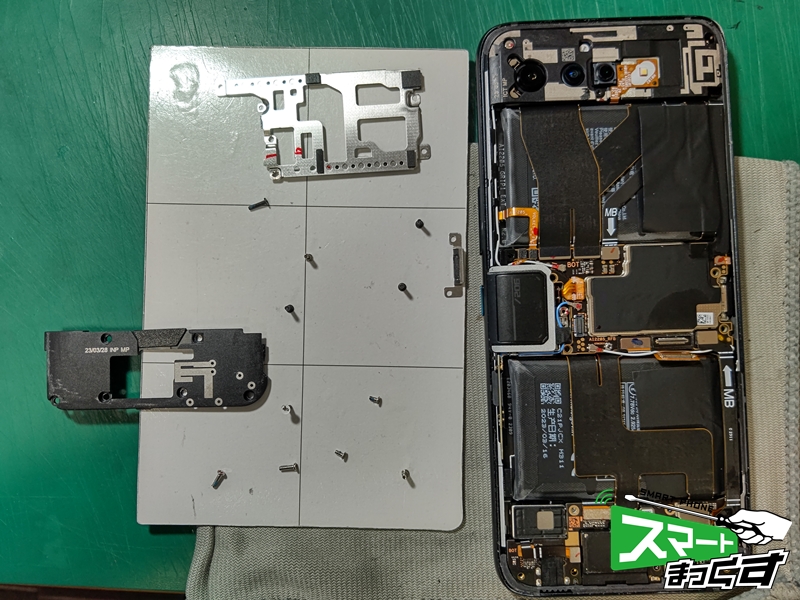 画面を取り外した後は新しい画面へと交換し、逆の手順にて組み上げていきます。ROG Phoneシリーズは部品点数も多いため、組み戻す作業も一筋縄ではいきません。どこにどの部品が付いていて、どのネジを使っているか把握しておく必要がございます。
