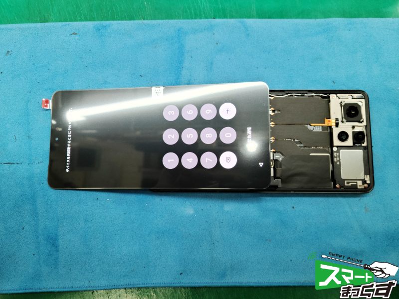 画面のフレキを取り外し、新しい画面へと取り付け、仮組みを行なっていきます。タッチや表示なども問題無く動作していることも確認できましたので、割れた画面を取り外していきます。