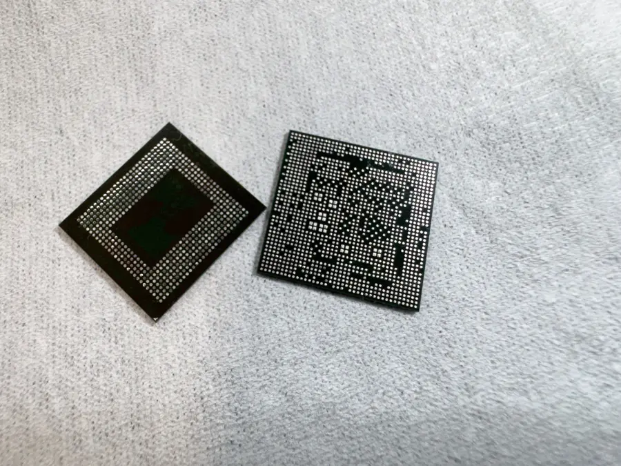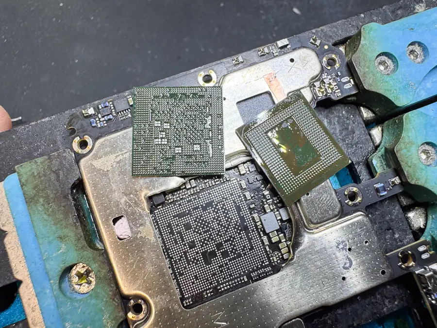 しっかりと熱を管理しながらヒートガンでチップを温めてはんだボールを溶かし、基板からCPUとRAMチップを慎重に取り外します。