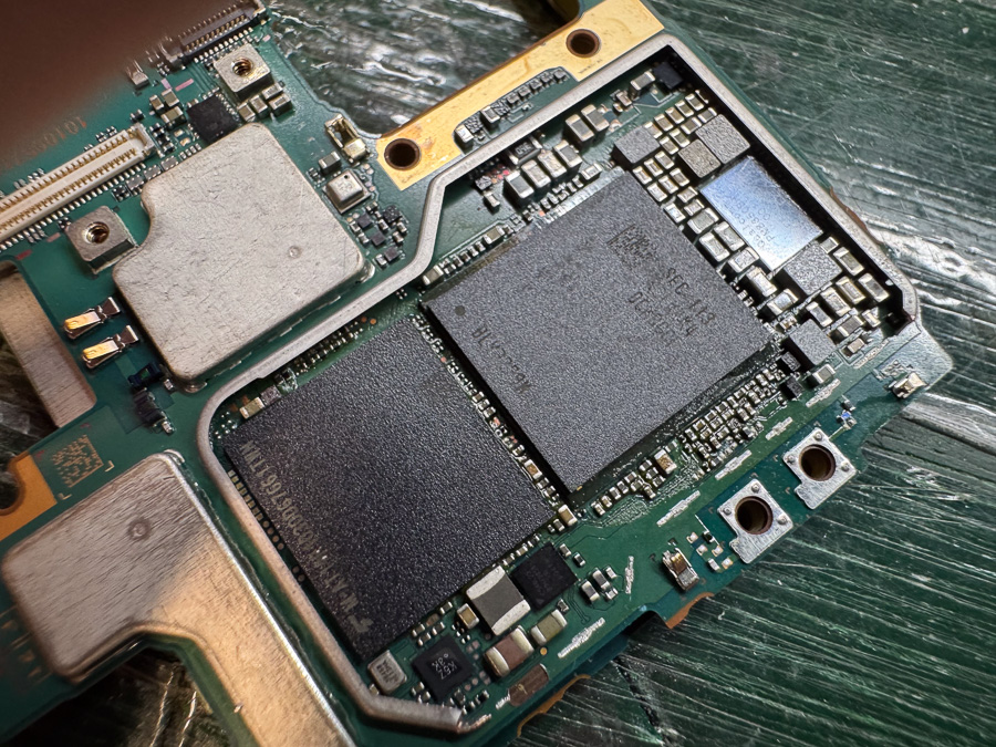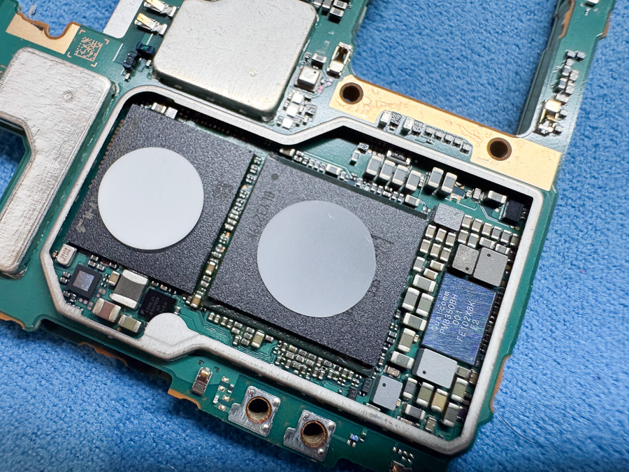 当機種ではCPUとRAMチップが二枚重なって実装されているため、熱の管理に注意しながら慎重に作業を進めます。