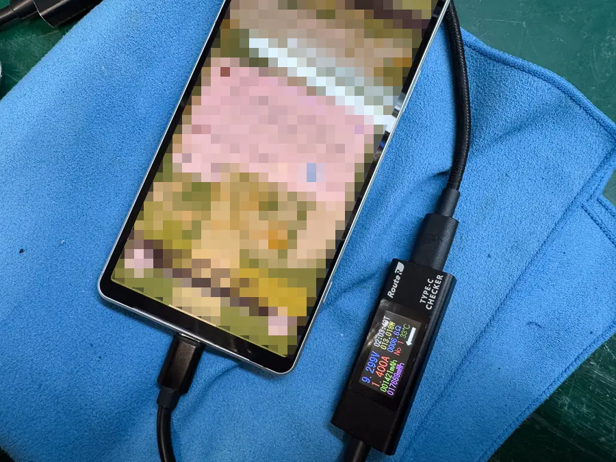 まずはお預かりした端末に充電テスターを接続して簡易的な検査を行います。
