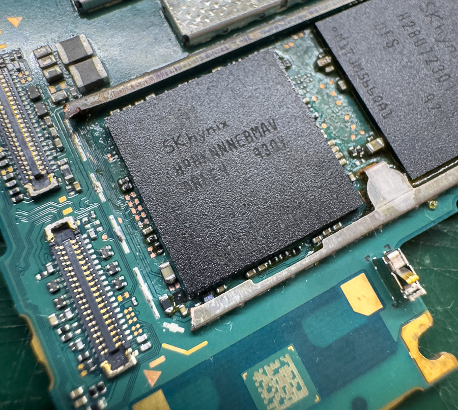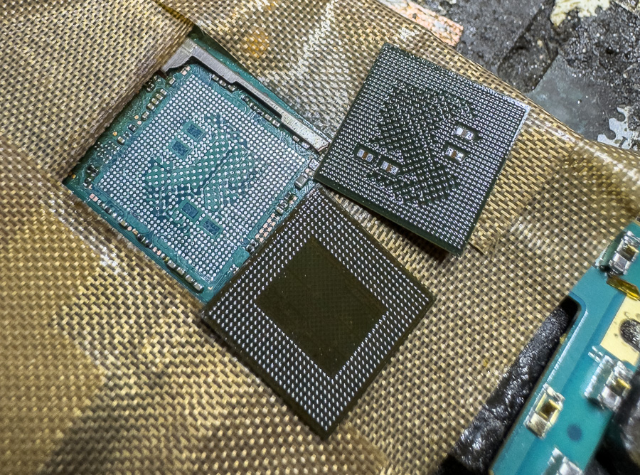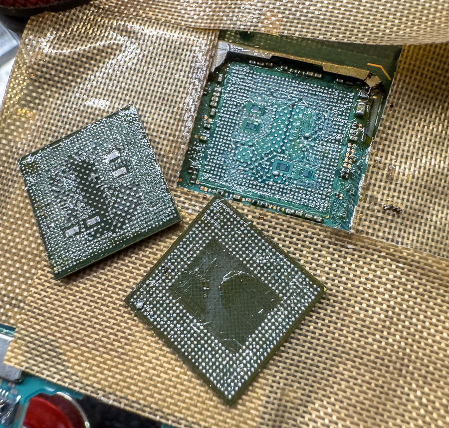 更に細かく状態を確認するため2層になっているCPUとメモリチップに熱を加えて基板から取り外します。